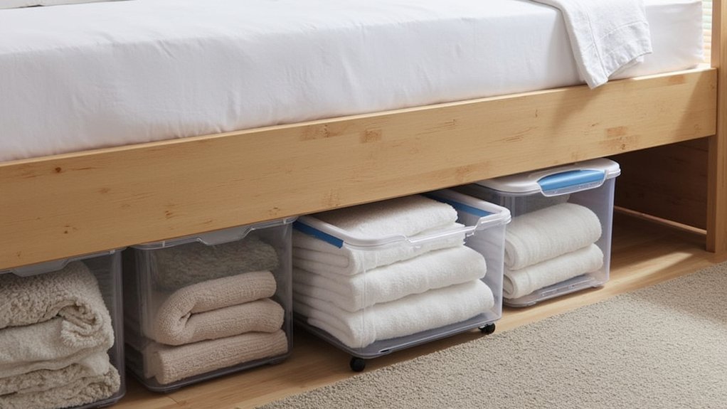 - Use Rolling Bins: Buy plastic bins (18”x12”x6”) with wheels for easy access; store linens or clothes.