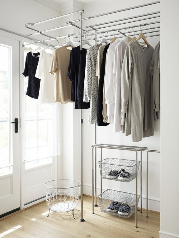 Corner clothing racks transform unused corner spaces into efficient storage areas for your wardrobe. These versatile units come in various styles and configurations, from simple single-rod designs to elaborate multi-tiered systems, allowing you to match both your storage needs and room décor.