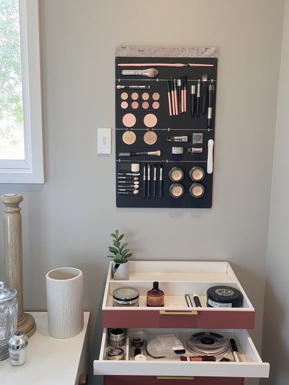 A magnetic makeup board transforms unused wall space into an organized cosmetics display system. By mounting a metal board and attaching small magnets to makeup items, you can create an accessible beauty station that keeps products visible and easy to reach.