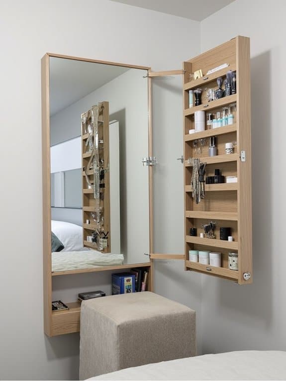A hideaway vanity mirror station offers a space-efficient solution for daily grooming needs while keeping bedroom spaces tidy and organized. By mounting a fold-down mirror with built-in storage on an unused wall area, you create a dedicated beauty station that can be concealed when not in use.