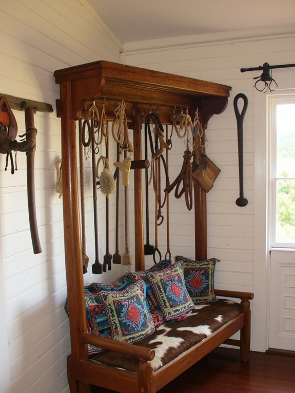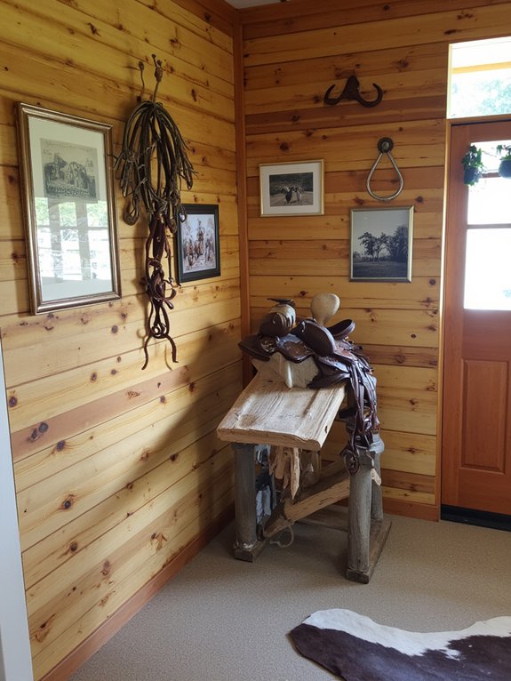 An antique saddle display corner transforms an unused nook into a striking western focal point that celebrates equestrian heritage. By mounting a vintage saddle at eye level on decorative mounts, visitors can appreciate the intricate leather tooling and historical significance of these pieces.