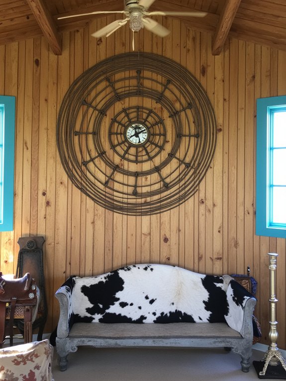 The construction requires at least 30 feet of genuine ranch rope secured in concentric circles with hidden fasteners. Optional decorative elements like conchos or vintage spurs can be added at quarter-hour positions, enhancing the western authenticity while creating an eye-catching conversation piece for any ranch-style space.