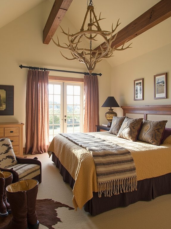An antler chandelier creates a dramatic centerpiece in this rustic-meets-elegant bedroom design, combining natural materials with sophisticated lighting elements. The fixture’s presence adds both illumination and artistic impact, with options ranging from simple single-tier designs to elaborate multi-level arrangements.