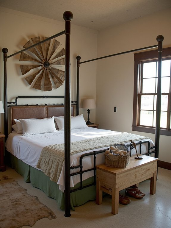 Decorative metal windmill art serves as an eye-catching centerpiece in western-themed bedroom designs. When mounted on interior walls, these rustic elements add authentic ranch character and create dramatic visual interest, especially when positioned above furniture like headboards.