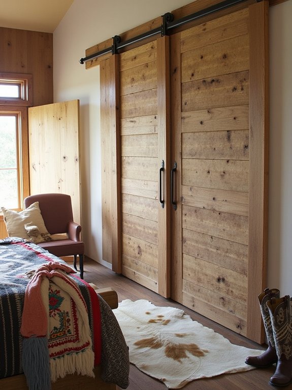 Sliding barn doors offer a stylish storage solution when used as wardrobe panels, combining rustic charm with practical functionality. The distinctive look transforms an ordinary closet into a striking design element while providing easy access to clothing and accessories.