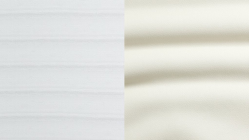 When comparing durability, pure cotton woven fabric typically outlasts jersey in wash-and-wear situations. You’ll find cotton maintains its shape better, while jersey can stretch out over time. A texture analysis reveals that cotton feels crisp and structured, whereas jersey offers a softer, more fluid drape.