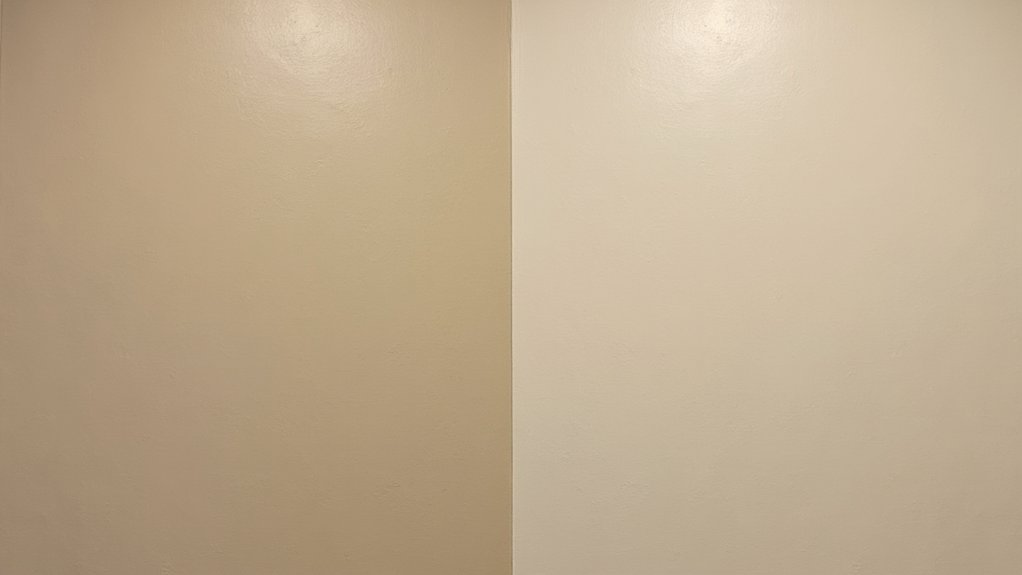 Picture yourself running your hand across a perfectly smooth wall, where every tiny flaw seems to vanish beneath the paint. You’ll find that flat or matte finishes, with their low 0-5% gloss level, are your best allies in concealing surface imperfections. These specialized paints work by absorbing light rather than reflecting it, effectively masking everything from minor dents to subtle texture variations. Before you pick up that paint brush, there’s more you should know about choosing the right finish for your space.