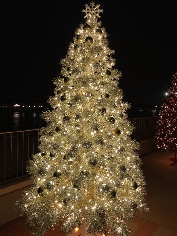 The decoration process requires 30-40 silver ornaments dispersed evenly across a 6-foot tree, complemented by 10 yards of cascading gold ribbon. A statement 10-inch metallic star crowns the tree, completing the contemporary look. This elegant approach brings a refined, luxurious element to traditional holiday decor while maintaining festive warmth.