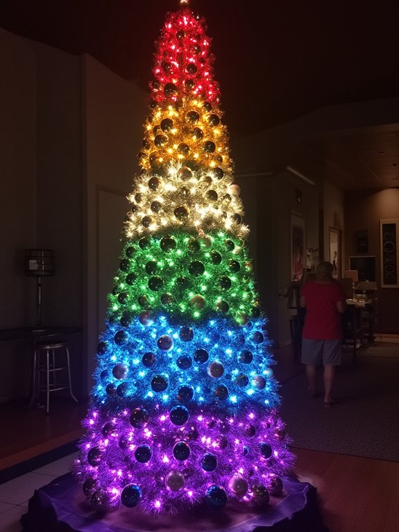 The creation process involves three main steps: installing colorful lights throughout a standard green tree, methodically placing dozens of ornaments in rainbow color progression, and crowning the display with a brilliant star topper. This systematic approach ensures a cohesive and dazzling final result that captures attention and spreads holiday cheer.