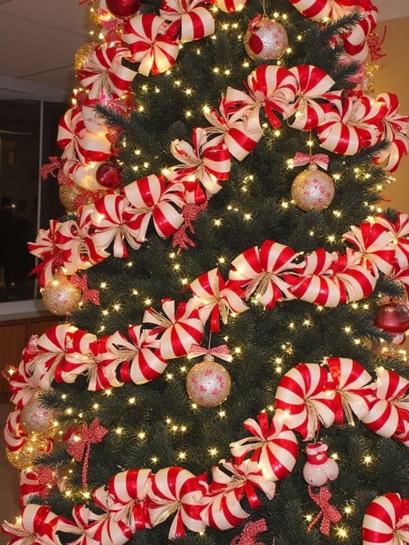 The tree comes together through strategic placement of 20-30 candy canes spaced evenly throughout the branches, creating a balanced, symmetrical design. Loose ribbon wrapping adds movement and whimsy, transforming a standard Christmas tree into a charming candy-themed centerpiece perfect for holiday displays.